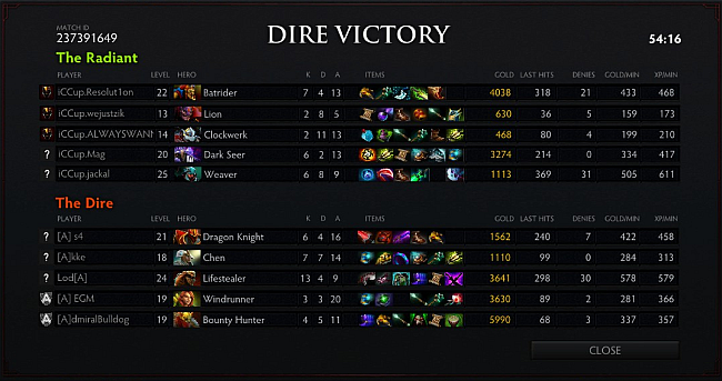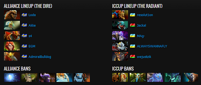 Fifty minutes into the match both squads knew that the slightest mistake would cost them the game. A long, two-minute fight took place in the Radiant jungle and bottom lane in which the teams pushed their skills to the limit. Akke's trademark Chen returned back to the base a 100hp Lifestealer who immediately teleported back and helped Alliance to destroy the enemy heroes with the cost of death. With iCCup's formation broken and Dire's creeps' help, Alliance pushed through middle and forced the "gg" in the 54th minute.