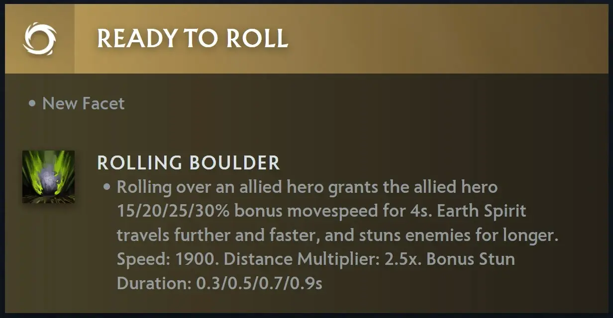 While Ready to Roll is handy and much better than the Stepping Stone facet, it won’t make a huge dent in Earth Spirit’s popularity and win rate. It is good to have the additional stun and movement speed, but in a team fight, Earth Spirit is not going to specifically look for an ally to roll over. The priority will be targeting the enemy. If there is an ally in the way, it is a bonus.