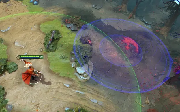 And we come to the final circus act, the Wheel of Wonder. Wheel of Wonder is similar to Will-O-Wisp, where the hero casts the ability and everyone in a radius can be disabled. With Wheel of Wonder, there are two things to take into consideration – the wheel radius and the cast range. The cast range of the skill is 1500, whereas the radius is 600. This is shown in the image below. The green outer boundary is the cast range for Wheel of Wonder. If it is cast within that boundary, Ringmaster will roll the wheel to the point, and the affected area will be a circle of 600 radius around it.