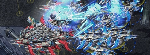 Good, then open wide and try not to choke on what MC and Grubby are feeding you, namely 50+ friggin phoenixes collapsing onto each other in a battle that looks like it has come out of a specifically designed UMS map. Come to think of it though, who else would ever build so much fliers in one PvP game but these two?