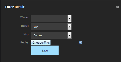 As Winner you set the winning team of the individual game and for Result you keep it as "Win" provided the match was played properly. The other options are "Forfeit" (if the losing team forfeited the game) or "Disqualification" (if the losing team was disqualified, but normally the admin would result the game for you in this case). To successfully save the result you also need to upload the replay of the game as a .rar file.