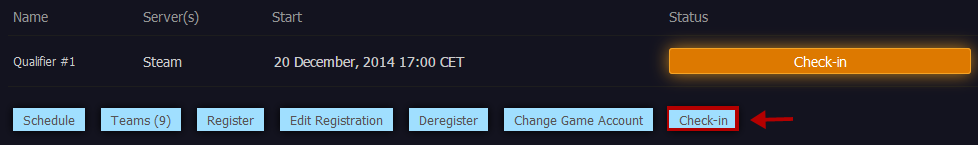 First, presuming you have registered already (if you haven't, check the following guide), simply press the "Check-in" button as displayed above. It is important that you check in if you intend to play, as only teams checked in will be part of the bracket at the time of qualifier start.