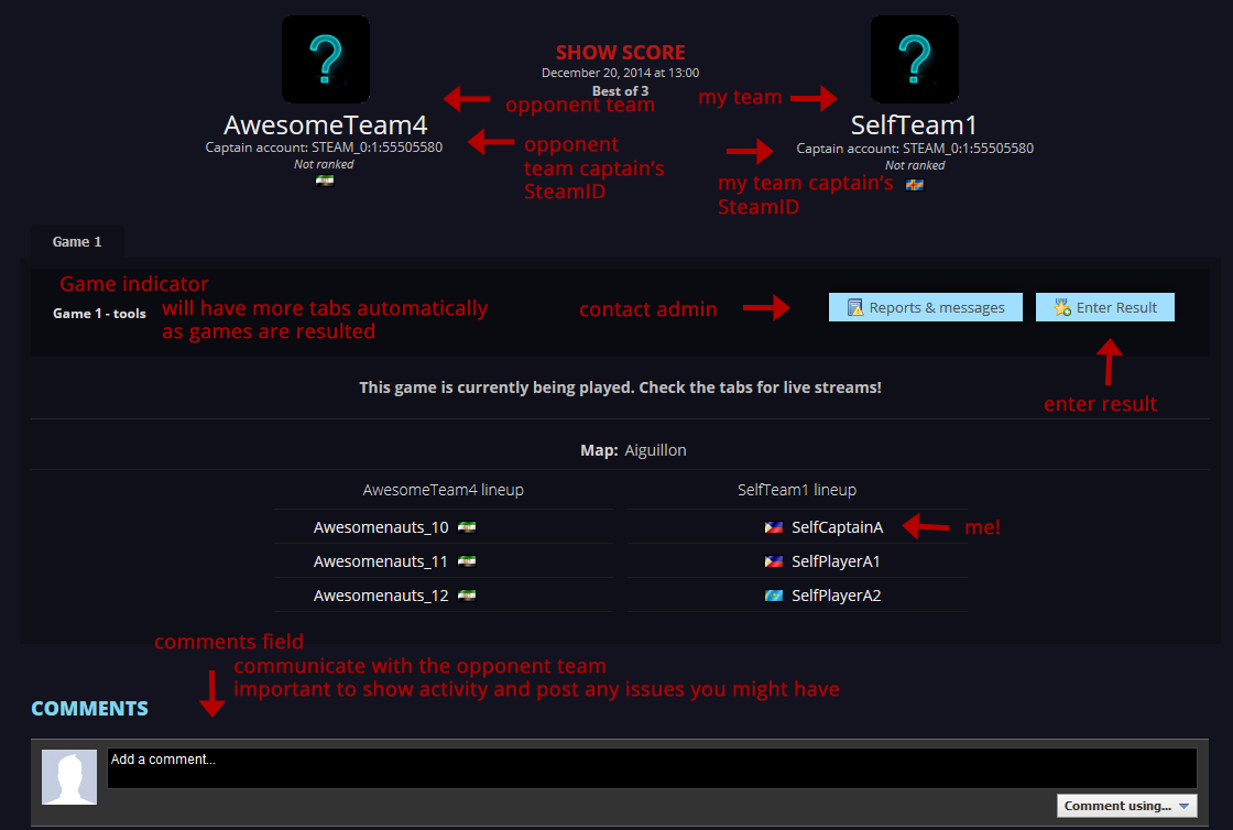 In this example your team is SelfTeam1 and you are SelfCaptainA, the captain of SelfTeam1. Your SteamID will be seen at the match page (in the example both captains SteamIDs are the same, but once again, it is just an example). You will also have the option to contact admins through the "Reports & Messages" and report the result of the game through "Enter Result". Note that you report the result for each game of the match. If it is a best of 3 match, it will contain between two and three games, meaning a result needs to be reported two or three times. Only one team needs to report the result.