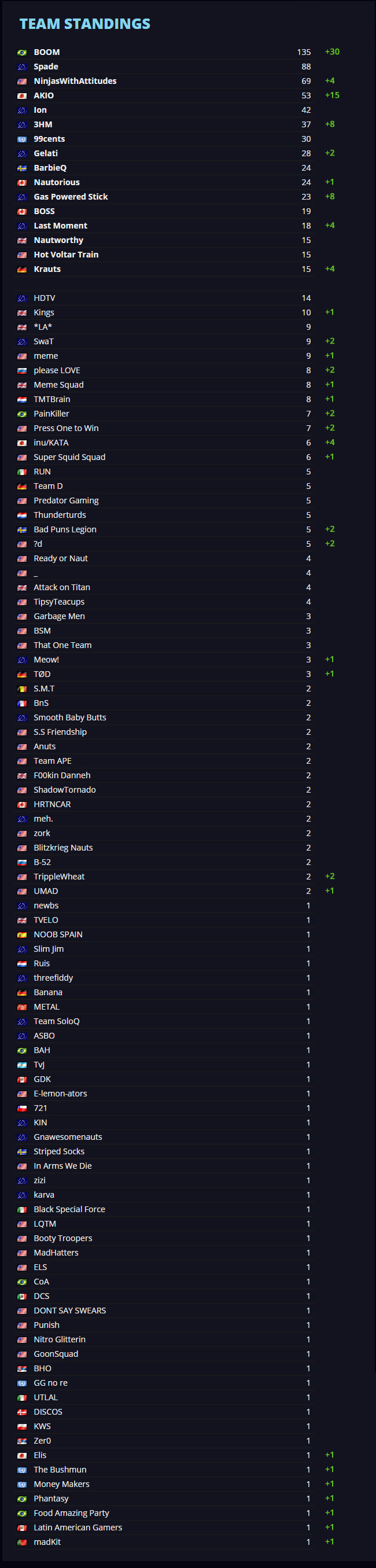 The eight overall qualifier is over and the standings have once again been updated. BOOM still on top and the cut-off is now 15 points.