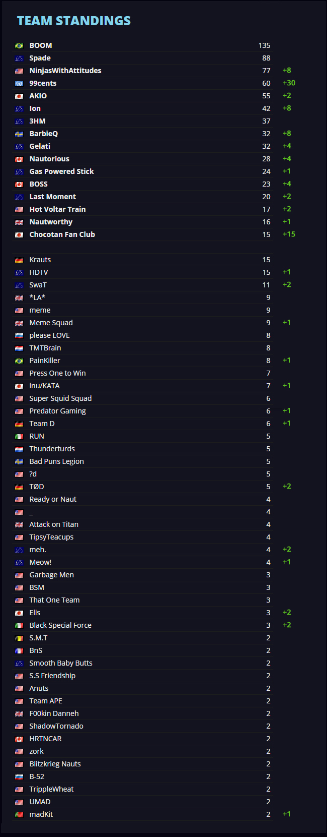 The team Kings are removed from the rankings due to intentional cheating by result abuse in the recent qualifier. They will not be allowed to register for further qualifiers of Awesome Cup #2.