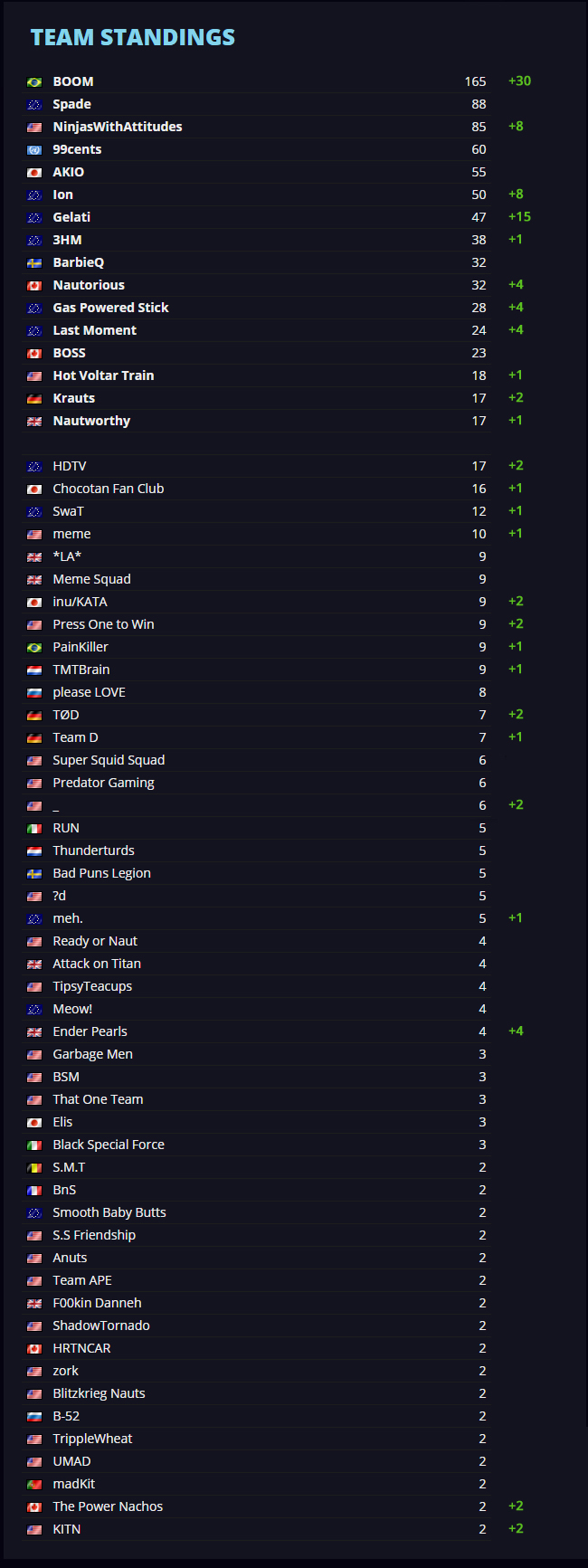 With only two qualifier remaining, it is getting more and more intense for teams around the 16th spot. Namely Hot Voltar Train, Krauts, Nautworthy, HDTV and Chocotan Fan Club are currently the five teams wrestling just around the corners of it. Three of those are above the mark, two below, but lots can still change as the teams surely will aim to secure more points in the remaining two qualifiers. Top 16 qualifies for the main event, ties are solved by a having a higher finished. For instance, one eight pointer will weigh heavier than two four pointers in terms of a tied final position.