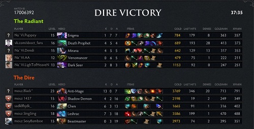 LighTOfHeaveN (Top) Dendi (Mid) Puppey (Jungle) AA (Bot) XBOCT (Bot) | Black (Top) 1437 (Top) ComeWithMe (Jungle) Singsing (Mid) SexyBamboe (Bot) |