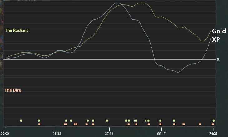 Both teams start the game off very defensively and played it safe - the only big difference happens on the off-lanes. Sylar is denying Windrunner a lot of gold and experience and she has to stay back to not get killed by the ganking combination of Shadow Demon and Leshrac. Batrider, however, manages to farm by using his flame break on jungle creeps to pull them and stealing a few last hits with the damage. By 5:30 minutes, Batrider sits on 18/2 whereas Windrunner only has 5/3.