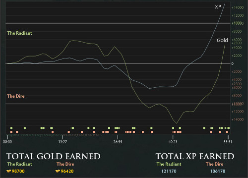![]() | The gold graph tells the story of this game. Liquid winning the early game by farming two carries and getting some easy kills, mouz pulling ahead with their Phantom Lancer and a slow, but steady comeback. An interesting thing to point out are the small boxes below the graph, showing the kills which happened. After the team fight around the 40 minute mark, there were no kills but the Radiant was completely outfarming the Dire at that point, ultimately leading to two MKB's and a Divine Rapier. | |||||||||||||||||||||||