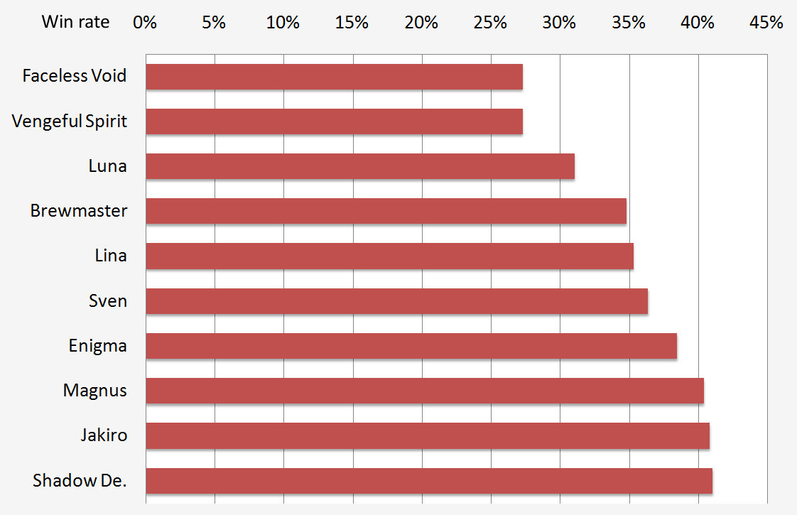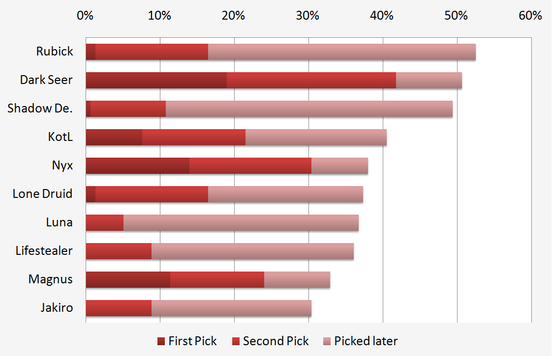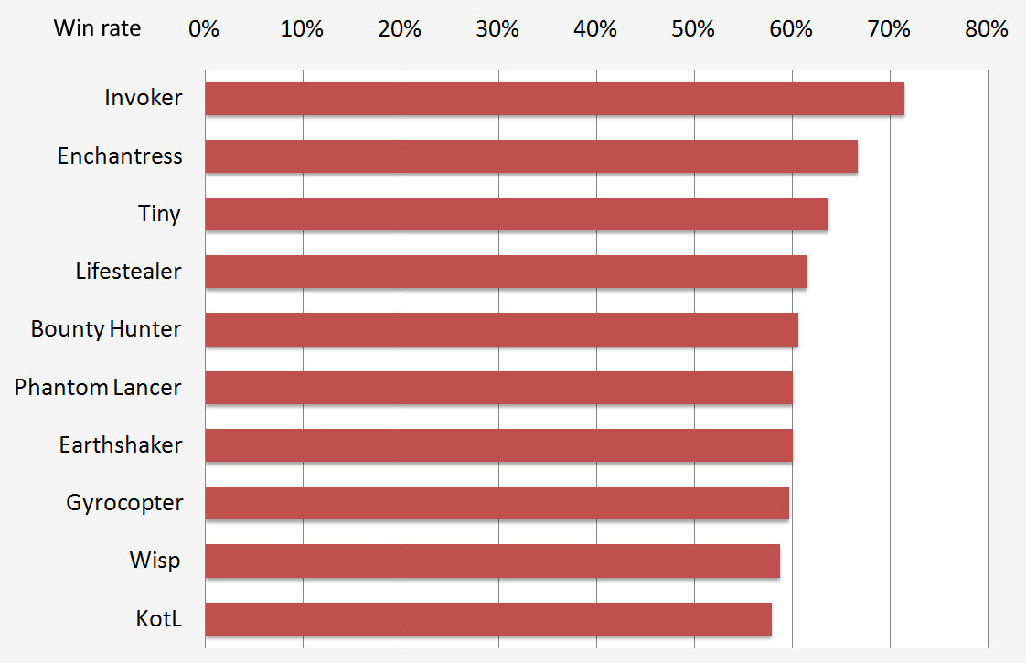To find out which heroes have the highest and lowest win rates, only the 50 percent of the most picked heroes were chosen - those with more than 11 games played. This is important since it makes sure that heroes with a 100 percent winrate who have only been picked once will not make into the list. Surprisingly, the most picked or most popular heroes are far from being the most successful ones. Invoker, who won 10 out of 14 games, tops the list. Heroes which appear in both this and the top 10 picked heroes are Lifestealer, Keeper of the Light and Wisp. It seems that to be a successful pick, a hero has to be strong in early game to score early kills and have a decent transition into late games as well. Carries are naturally very strong in late game, but Phantom Lancer's nuke and Lifestealer's slow are also very good in early game. On the other hand, Enchantress and Tiny are two prime examples on good early and late game, especially when picking up an Aghanims Scepter. It is interesting that we see top picks appear in the list of the least successful heroes, such as Luna, Magnus and Shadow Demon. The carries in this list have a far worse winning rate than Lifestealer or Phantom Lancer and it could be that they were outcarried both in the late and early game by these two.