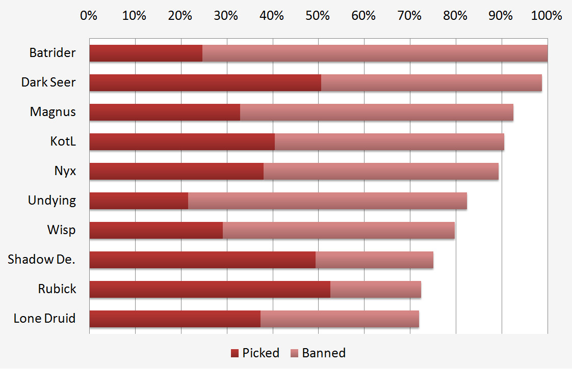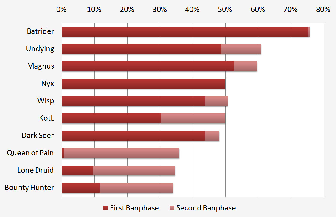 Rubick tops the list of most picked heroes, having been played in over half of all games. Both him and Shadow Demon were both chosen mostly in the second pick phase and are banned rarely compared to the other top picks such as Dark Seer. It is also interesting to see that carry heroes tend to be picked up in the second picking phase, with only Lone Druid being chosen in the first phase. There are many heroes who are both picked and banned frequently (see chart 'Popular heroes') and therefore appear in both lists - Batrider being the exception. He is banned in three quarters of all games, almost entirely in the first ban phase along with Magnus, Undying and Nyx. The hero banned the most in the second phase is Queen of Pain.