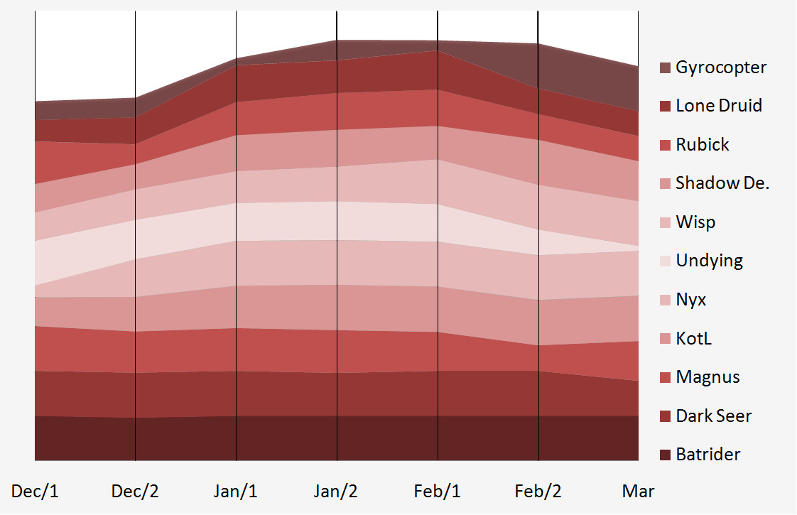 The 'Most Popular' chart looks at both pick and winrates combined. It shows that Batrider was picked or banned in 100 percent of all games, but banned more often than picked. Generally, these top contested heroes are banned more often than they are picked - excluding Darkseer who makes it through the bans about 50 percent of the time. Additionally Rubick and Shadow Demon, both of whom are in the top 3 picks, are banned less frequently. The chart to the right entitled 'Top 10 most popular heroes trending' looks at these top ten popular heroes over the span of the tournament. For this, the duration of the tournament was split down into periods of two weeks and the popularity rates were calculated for each of these periods. As you can see from the chart, the most contested hero, Batrider, was highly popular over the entire span of the tournament, just like Dark Seer and Magnus. After not being too favoured in the first half of December, Nyx quickly became a top pick; Undying's polularity however faded over time. Gyrocopter was not in the Top 10 for Most Contested Heroes - 16th place to be exact - but since he is the 'current flavour of the month', he was added to the chart. It is clearly visible that throughout all of December, January and the beginning of February, he was rarely picked but suddenly became the most popular hero for the last two periods.