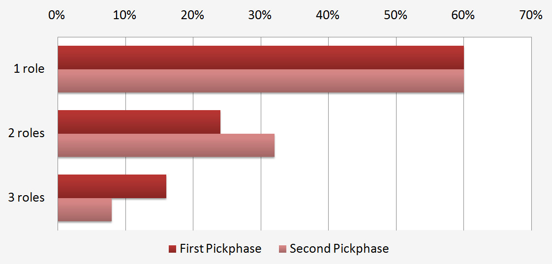 The results: The average first phase pick can be put on 1.56 different lanes, the average second phase pick on 1.48. However, this difference is not significant (Statistical sidenote: chi² (2) = 0.952, p > .66). This means that heroes which are picked earlier in the draft are not more versatile than the heroes which are picked later.