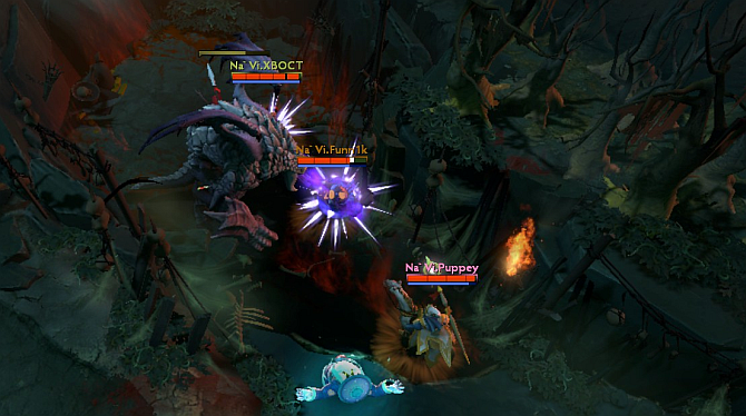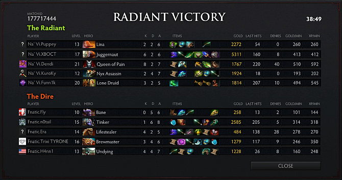 On the middle lane however was a completely different story. Came 8 minutes, n0tail's Tinker was already two levels down compared to Dendi's Queen of Pain and giving away the First Blood did not help either. Na`Vi grouped up ten minutes into the game and threatened to push Fnatic's top tower but Fnatic was quick to respond by rotating five of their heroes too. Na`Vi's second attempt at the tower was successful but it came at the cost of three heroes including the Juggernaut. Meanwhile, distractions at top allowed Lone Druid to take down two towers on the bottom lane.