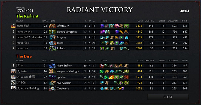 Mousesports bizarre and greedy line-up turned out to be a sick combo, chaining off the Nightmare, Unstable Concotion and a few right clicks by the Anti-Mage and Nature's Prophet was rewarded with the First Blood on Loda's Lifestealer. As the first night came, Night Stalker and Alchemist started running all over the map ganking and were successful in getting Magnus to waste his Reverse Polarity or risk dying. Lifestealer.