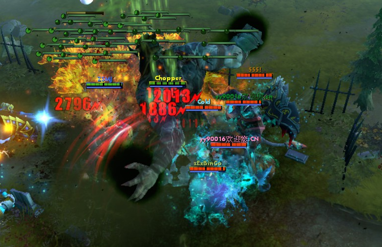 As you can see from the screenshot above, all the high DPS heroes such as Sven, Phantom Assassin and Troll Warlord are bunched up behind Undying. All of them have at least two Battlefury(s) and Rapiers for this purpose.
