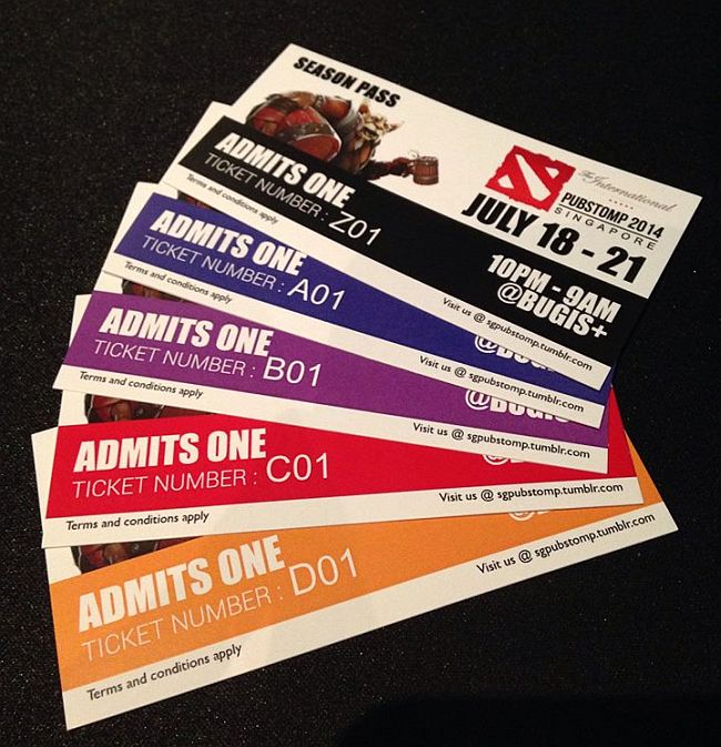 For an additional fee, gamers were allowed access to computers at the premises as well, with their names automatically entered in exclusive raffles, turning the pubstomp into a LAN party and viewing event. Tickets were sold for both individual days as well as the whole duration of the event. Early bird prices for the tickets were $15 a day, or $45 for all four days. Normal prices were at $20 and $60 respectively. The tickets sold like hot cakes on the first day, with most of the tickets sold out within an hour from being on sale.