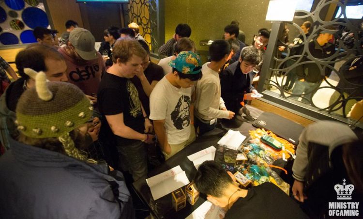 Every pubstomp ticket sold includes between 5 - 20 voting slips for the participant. It was a simple matter to write our names and numbers, and at the end of the pubstomp a random person would be drawn from the tin depicting the winner. Up for grabs were Steelseries Keyboards and mice, along with autographed Dota 2 Loading Screen prints from Kendrick 'Kunkka' Lee.
