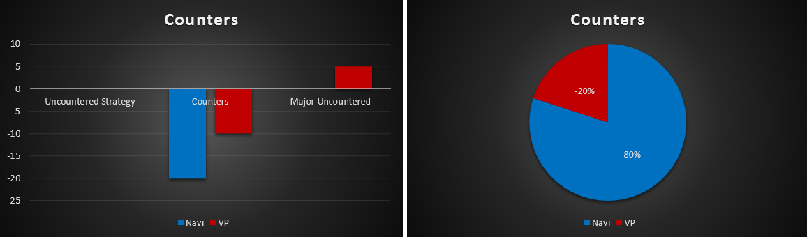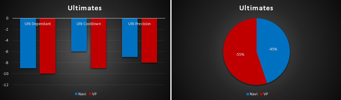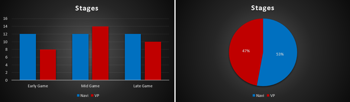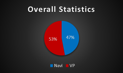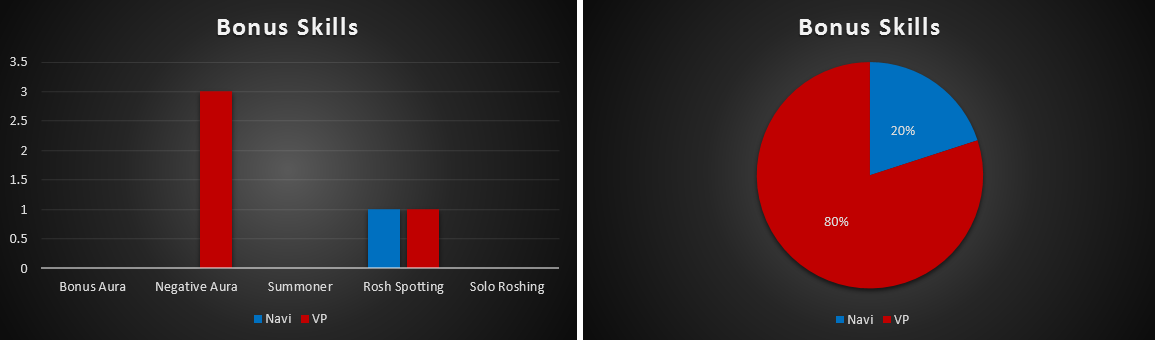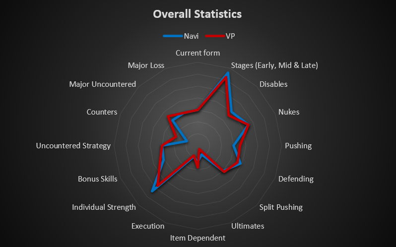 VP had an advantage in Items, Execution, Bonus Skills and Counter. Navi had an advantage in Stages, Disables, Individual Strength and Ultimates. VP had a 53% overall advantage but it was a minor lead. The game heavily relied on early game ganking potential of Navi and in shutting down of Shadow Fiend. With excellent wards VP failed Navi’s early ganks and with that they secured their early game.