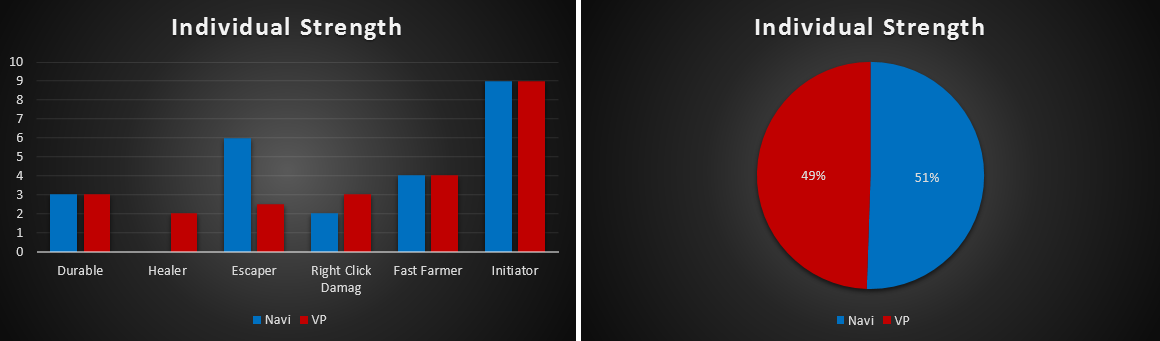 Both the teams had a well-balanced draft but Navi had more heroes with escaping abilities and VP had more heroes with healing abilities. Other difference are very few hence none of the teams have a major advantage here.