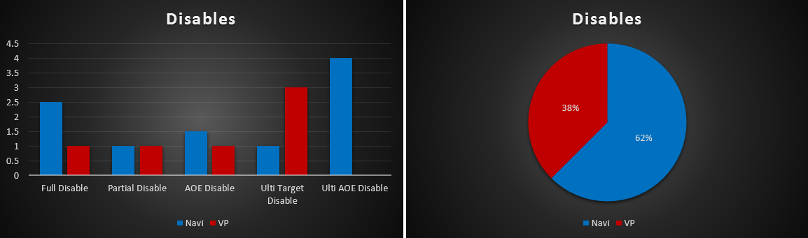 Navi had many good disabling spells such Sand King and Earthshaker’s AOE Stun and Puck’s AOE Ultimate. Whereas VP had Bane, one of the strongest single target lockdown hero and AOE stun from Centaur Warrunner.