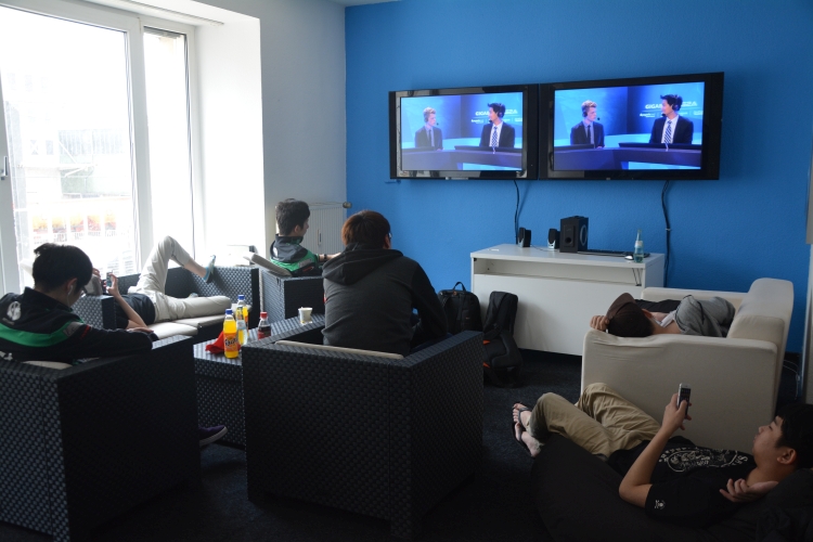 We (me and my roommate Kecik) received our wake-up call at 6.30 in the morning because we were suppose to leave for the ESL studio at 8. That is really quite early, especially for gamers, and I very reluctantly got out of my comfy albeit small bed for breakfast. Maybe that's why I only saw managers, personalities, Zai and iG players in the 30 minutes I spent eating croissants. However, the schedule is understandably tight and we have to also leave for Frankfurt via a shuttle after the seeding tournament.