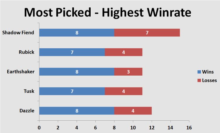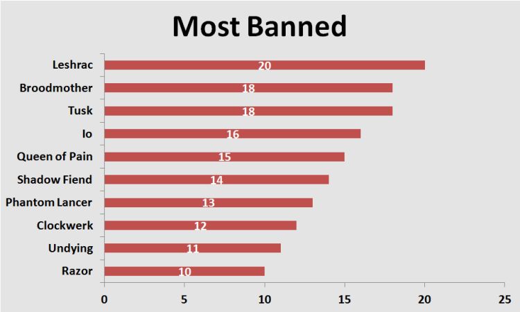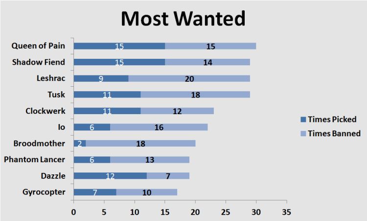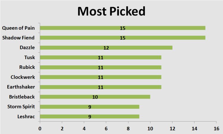 This tournament really exemplified the pro scene’s current interest in ganking, space-creating midlaners. Not only were both Queen of Pain and Shadow Fiend the tournament’s most picked heroes, but there were also a number of appearances by Storm Spirit and (of course) Leshrac. With the exception of perhaps Bristleback, there aren’t really any heroes on this list who fit the description of a traditional static, farming position two: noticeably absent are heroes like Dragon Knight, Razor, Viper, etc. It should also be noted that there isn’t a single hard carry to be found here, further drawing attention to the metagame’s current focus on early to midgame map control. The drafting focus right now seems to be more centred around cores who can come online quickly and complementary supports who possess a great degree of movement and utility.