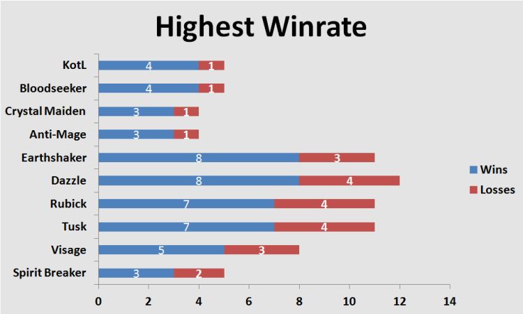 This statistic really only serves to demonstrate the current strength of Team Secret and the viability of their current ‘pocket strats’. Three of the top four heroes on this list all found success at the hands of the tournament’s champions. Keeper of the Light was played five times throughout the tournament; Puppey played the hero four times and won all of his matches. All four of Bloodseeker’s picks were executed by Secret (he was played three times by Arteezy and once by KuroKy) and proved the victor in three of his matches (including when he was played in the support role by KuroKy). Lastly, Anti-Mage saw victory all three times that Arteezy played him, with the hero’s only other match being when Fear played him into a loss against Secret in the tournament’s finals.