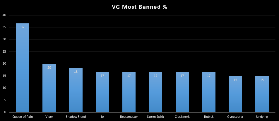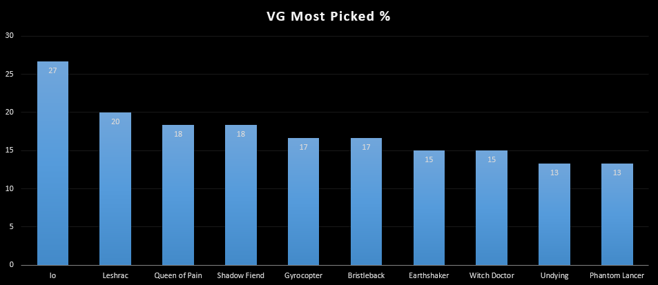VG has picked wisp more than anyone else on this list, it may not be the most famous hero in the meta but fy plays a great wisp. They also pick Leshrac and QWOP often which isn't a surprise since both Super and Hao play it and they are very strong at this very moment. Hao's signature hero is Gyrocopter and VG also has good win rate on it. Only three support heroes are in the top ten, which shows that fy and fenrir are extremely versatile. They also pick Bristleback and Shadow Fiend a lot which aren't the meta heroes but VG seems to rely on them a lot which can be both a good and a bad thing.