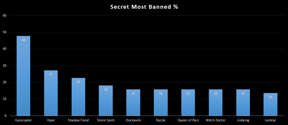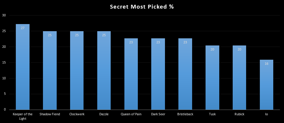 Secret doesn’t change their picks a lot, it has seven heroes with pick rates betweent 23% and 25%. Secret’s most picked hero is Keeper of the Light for Puppey which is not a surprise considering he is amazing on the hero. Moreover, KOTL isn’t a “famous” hero by any means so it gets through unbanned most of the time. Second on the list is Artour’s Shadow Fiend, his signature hero. Although SF isn’t a “Meta” hero, it still works with most lineups and Arteezy’s able to pull of amazing plays on the hero. Zai’s Clockwork is a staple pick for the squad, he makes plays and gives them great vision across the map which allows them to take fights on their own terms. S4 is a very versatile player therefore has only two heroes in the top ten most picked and those are Queen of Pain and Bristleback. QOP is definitely the most famous hero in 6.84. On the other hand, Bristleback isn’t a very popular pick but is a great tanking hero therefore works well for the squad.