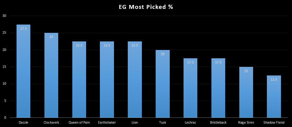 EG’s most picked hero is Dazzle which isn’t a huge surprise since most teams don’t ban it and ppd plays a great Dazzle. The big breadwinners for EG are mostly signature heroes for their players. Universe’s Clockwork is the best in the world; as soon as he hits level 6, he becomes a constant threat on the map. Queen of Pain which is “THE” hero of the Meta (a 96% pick or ban rate), both SumaiL and Fear play it and is a great pick for either of the two. SumaiL plays it as a farming hero while Fear plays it as a space creater. Another hero that can be played by the two is Earthshaker, both Universe and ppd can play the hero and it has become a guessing game where it’ll go which confuses their opponents.