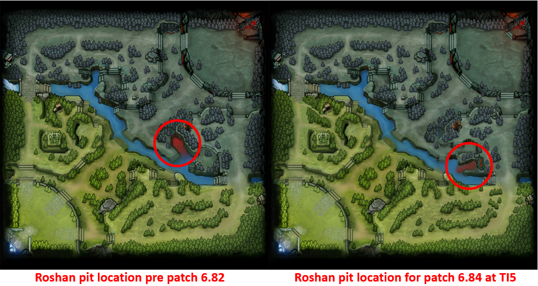 One of the biggest changes going from TI4 to TI5 was the location of the Roshan pit on the map. For the first four TIs, it was on the lower Dire side, opening up in the direction of the Radiant bot tier 1 tower. Dota 2 patch 6.82 changed it, still keeping it on the lower Dire side, but changing the opening to face the Radiant mid tier 2 tower. Roshan is a massive objective in the game, and a location change would have required teams to recalibrate how they approach fights near the Roshan pit. The new Rosh pit played a big role in the iconic moment of TI5, the $6 million Echo Slam; it wasn’t location that led to that moment.
