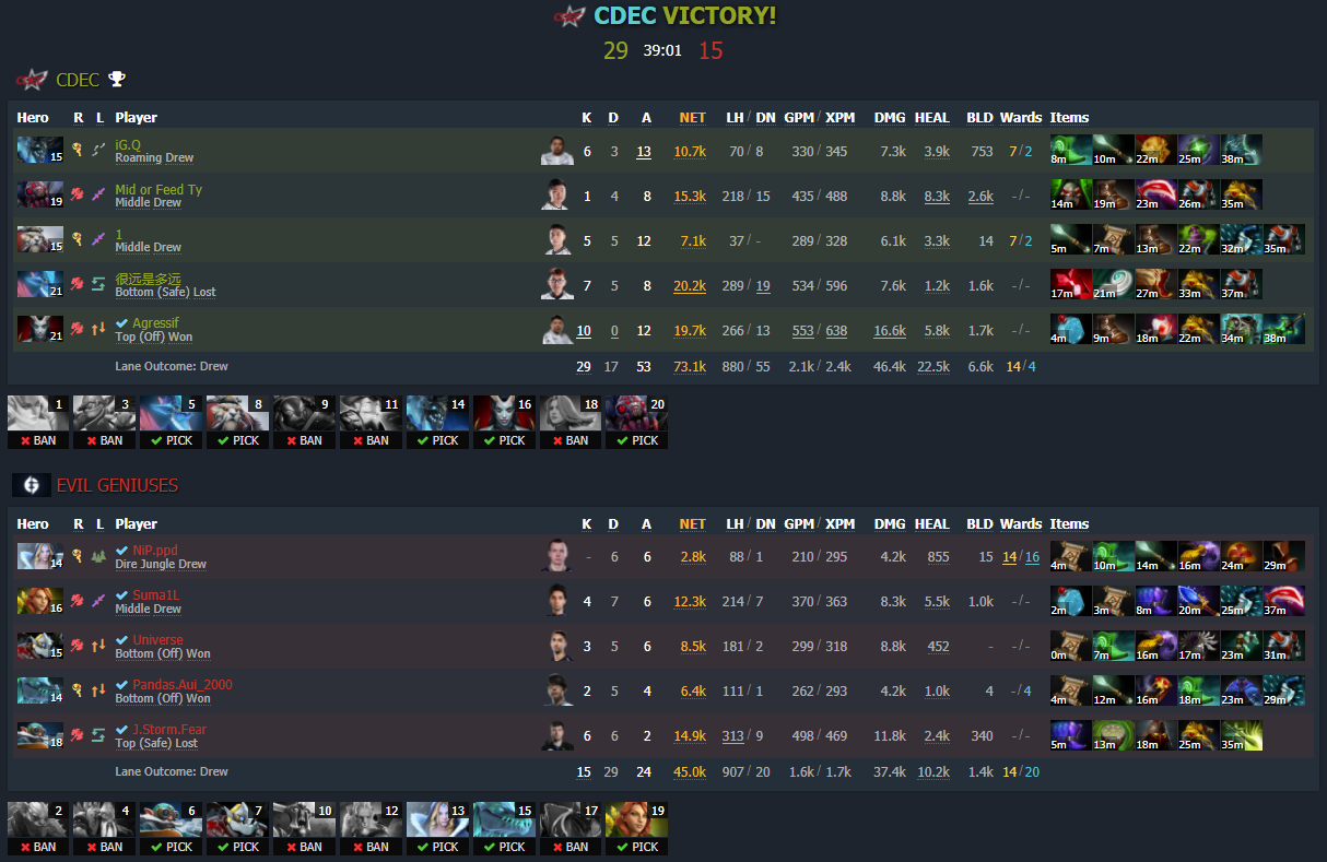 Games 2 and 3 were good indicators of the comeback aspect. The net worth was always in favor of CDEC, but there were times where EG were able to make small comebacks and pull back the net worth. This is what made for exciting games, as viewers did not have an idea of what would happen in the team fights (which is how it should be). The outcomes of team fights depended on who got the jump on whom and the angle of approach.