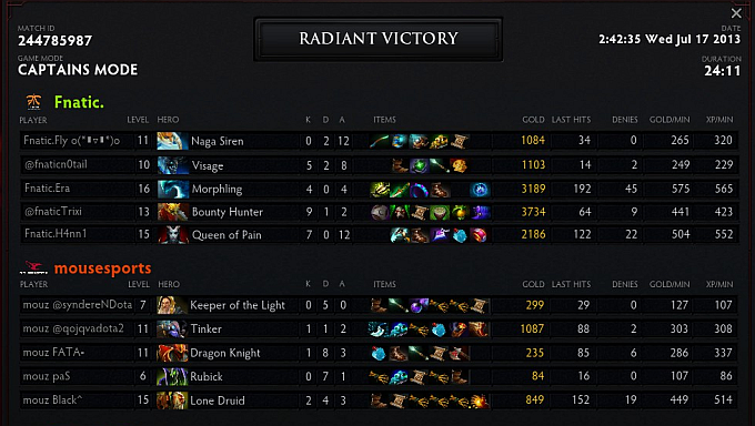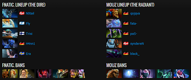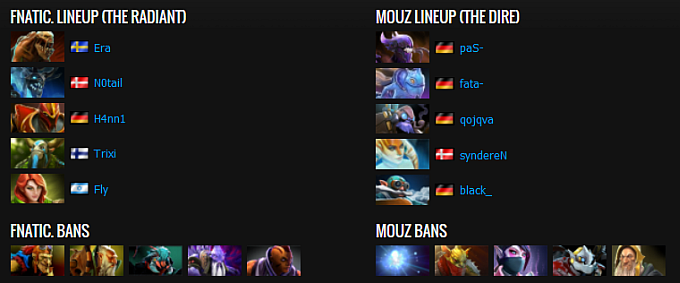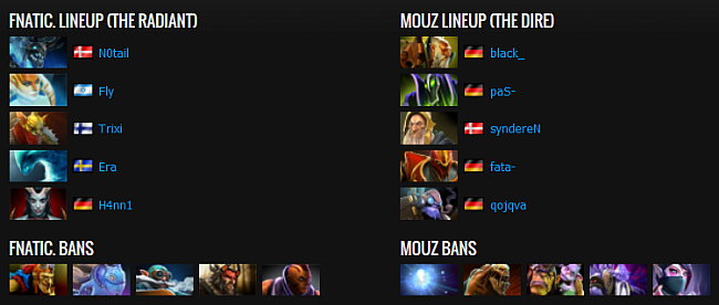 The game deciding battle happened at the entrance of the Roshan pit. Puck and Tinker happened to be in the wrong place as the Lifestealer-infested Prophet teleported in and killed both the heroes immediately. Naga tried to save the rest of his teammates but ended up dying, together with his teammates. Fnatic quickly took the two barracks on the middle lane and shortly after, Roshan. The game ended when Mousesports failed to defend their bottom barracks from going down.