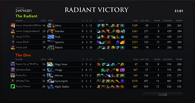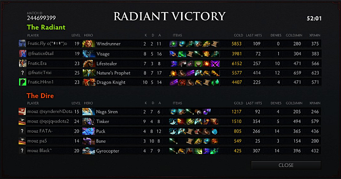 Without hopes to win the mid-game, Black opted to go Radiance but Fnatic was not ready to let the game go late. They grouped up and started pushing all the lanes. One teamfight on the bottom lane later, Mousesports pulled out the white flag and allowed Fnatic to advance.