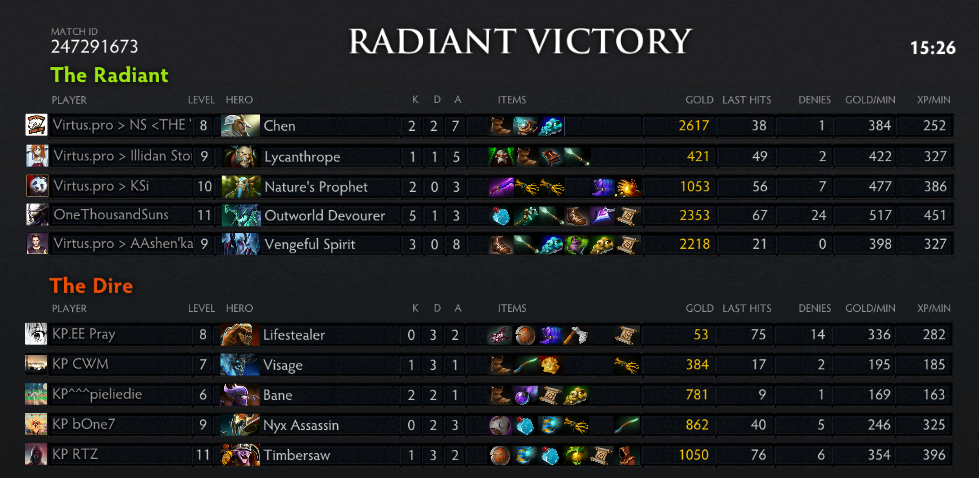 Virtus.pro continued their recent upswing with patient and mastered play in the match vs Kaipi. Kaipi tried some signature funk, such as Spirit Breaker and Timbersaw but Virtus.pro was not impressed. They allowed KP to have their fun for a while before taking control of the match-up and claiming the victory.
