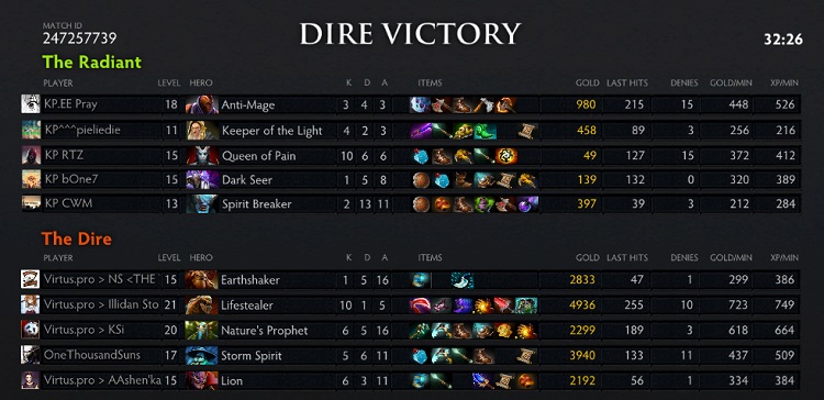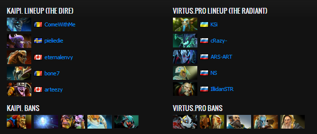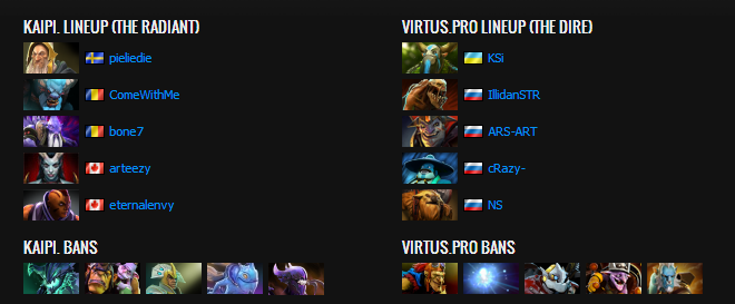 Meanwhile, Pieliedie positioned himself at the top lane, pushing away the creeps from the tower to ensure it still standing. VP had at this point started to get a hang of how to deal with Kaipi and responded well to the aggression. Illidan's Lifestealer was diving two towers to get a kill on KotL and quickly infested a nearby creep right after, thus preventing the two nearby KP heroes from killing him. Great Earthshaker play by NS, the lockdowns of Lion as well as his merciless finger kept Kaipi at bay and Virtus.pro were pulling more and more ahead. Virtus.pro proceeded to take down Roshan while defending most of their towers. Illidan was getting ridiciously big at this point, especially when teamed up with the Medallion debuff from Prophet. Kaipi's heroes melted like butter. Virtus.pro pushed in through the midlane and Kaipi threw in the towel.