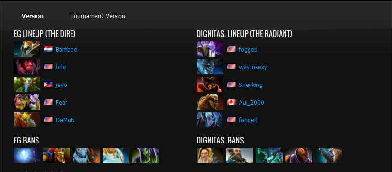 In the first game of the best of three series, Dignitas ran a rather unconventional lineup by picking Doom and placing him at the midlane up against Jeyo's Prophet. The game started out very intensely with numerous clashes from both trilanes at the top lane resulting in three fast kills at minute two. Both teams continue to trade kills at top lane until EG reached a crucial point in the lineup where both Nyx Assassin and Bounty Hunter are able to reach level six. With the intense pressure from the tri-ganking combo: Nyx Assassin, Nature's Prophet and Bounty Hunter, Dignitas were picked off easily and were forced to play safe. However, the game was cut short as Dignitas forfeited the game after experiencing internet issues. Game one was forced to a short end leaving spectators and EG feeling very confused.