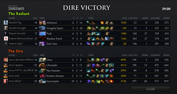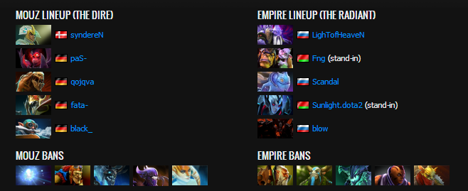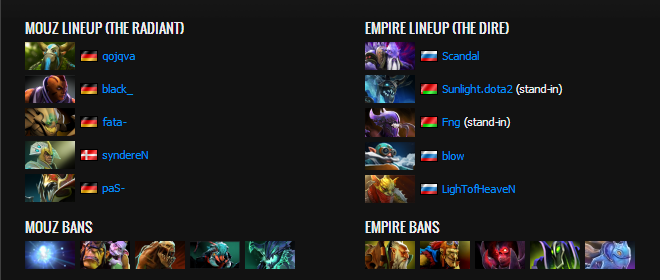 Empire kept going into the enemy jungle, trying to find kills, but they once again got picked off and lost three heroes. Empire attempted Roshan but mousesports intercepted and won the fight due some out-of-sync ability combos by Empire. After that, both Sand King and Nyx picked up Dagons. If that was not enough, Sand King kept upgrading his Dagon. Empire found a few kills in the period after that though, mostly on Qoqjva who kept getting caught. At the next Roshan, mouz brought it all back again where Empire tried to steal the Aegis but got massively punished for it. They called the "gg" after it.