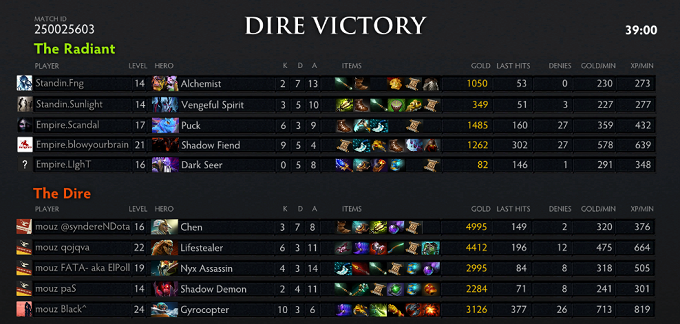 An extended chase on Black resulted in a mousesports almost team wiping Empire (Black did go down though) but Empire bounced down quickly, took some fights where their heavy right clicks dealt the damage necessary. Empire were taking control of the game but lost their advantage when they overextended massively, diving the tier 3 tower bot where they got impatient and fed a triple kill to Black. A huge pick-off for Empire happened on the top lane where Blow blinked offensively and killed mouz' courier, which was carrying a gem at the time. Empire picked up the gem and forced a fight at mouz's top tower. Despite Shadow Fiend dealing massive damage, the teams traded quite even, with Black surviving and Blow not.