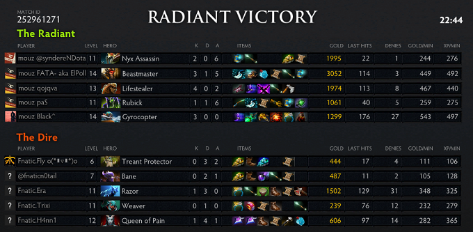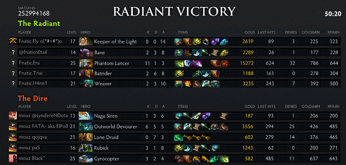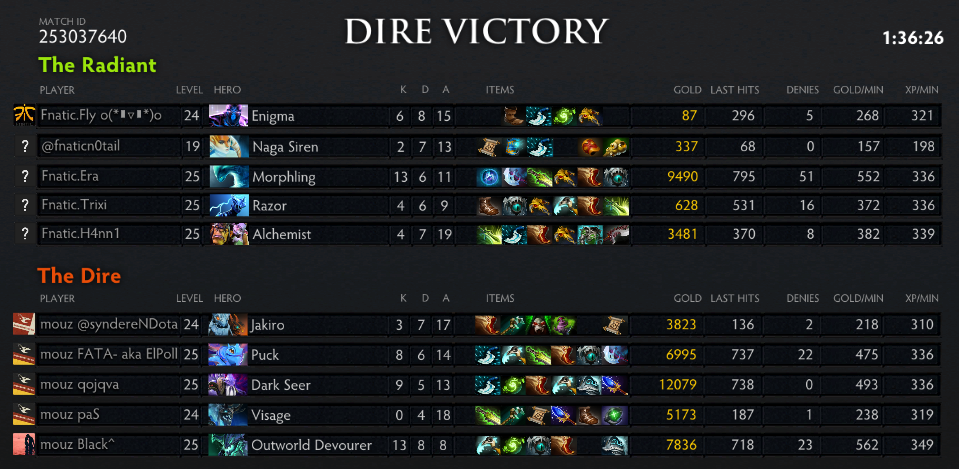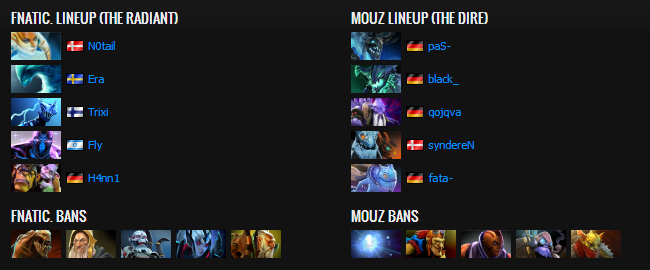 A huge blunder by Fly gave Qoqjva the first blood with the solo offlane Lifestealer, after which he abandoned the lane to go jungle. Shortly after, FATA got a solo kill on the slightly overaggressive H4nn1 mid. Qoqjva returned top after jungling up his Phase Boots and FATA, after getting ganked once, kept pressuring H4nn1 mid. Together with syndereN he killed off the QoP two more times. Great rotations from syndereN also turned a dire situation into three kills for mouz. At minute 16, mouz had the three most farmed heroes on the map. The small fights kept taking unlucky turns for Fnatic, mouz were pretty much steam rolling them at this point and it became oh so appearant for Fnatic as well as mouz were pushing their bot lane. They forfeited and set aim for next game.