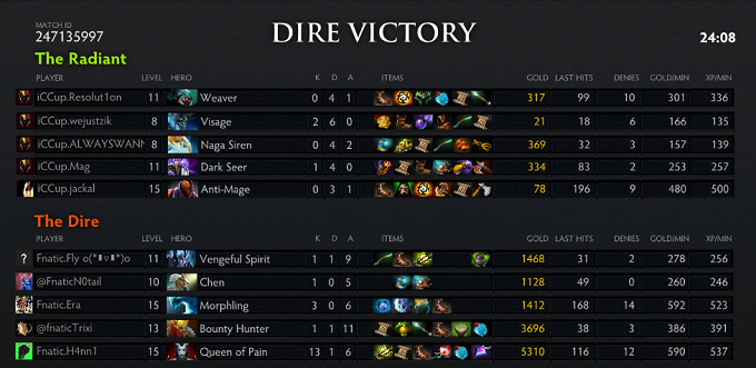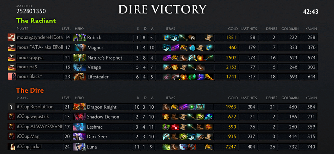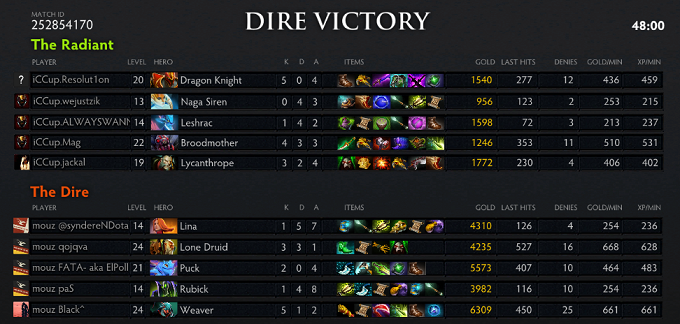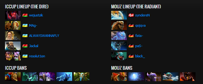 The momentum was starting to shift to mouz due to double Midas and going for a more late game oriented style. However, while MAg was baiting and picking a fight and then run away with Brood on top, the rest of iCCup went into the Rosh pit to fish an Aegis. The Radiance of the Spirit Bear and Weaver's huge solo kill potential kept iCCup from pushing properly though. iCCup would have to rely on finding either Black or Qoqjva, take him down and then transition into a push. An extremely well timed Song of the Siren stopped mouz from killing off Roshan and allowed Resolu1on to just walk into the pit, take the last hit and steal the Aegis. Mouz were forced back but Resolut1on wasted the Aegis right away when walking into the gem-carrying mouz team. A new Naga sleep got him out safely. After a longer period of split push and counter-push from both teams, paS and syndereN stalled iCCup in the Rosh Pit while the other cores of mouz were pushing one lane each. Black was huge at this point and successfully managed to destroy both bot barracks. And it was eventually base race time again, but this time mouz took it without too much excitement. The Lone Druid and Weaver were just too devastating.