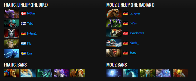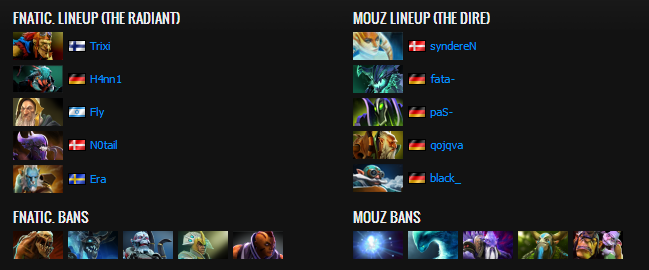Fnatic were tricked into an awkward laning phase where they picked the Razor to up against OD mid. Mouz opted for a trilane farming OD though and picked Puck for mid lane, Fnatic were now "stuck" with Razor without no clear lane for him. They did not send him mid which might have been a better solution instead of last picking the mid Alchemist. When diving the bottom tier 2 tower after taking out the first one, Fnatic got the first blood. However, as always the ever-so-quick to rotate FATA, teleported in for a double kill on Era and Trixi. Alchemist farmed up a Dagger as his first item while Naga Sleep into Black Hole scored Fnatic a double kill on top lane. Also there was the now roaming(?) Razor, appearant that Fnatic did not really know what to do with this hero after the draft finished. Overall, FATA's rotations were better and more successful than H4nn1's, making better use of the laning phase (also winning the lane). Fnatic managed to land a few successful Concoction Blink initiates, granting his team a few kills. However he also attempted to blink in and steal the Aegis, failed miserable and gave up a free kill.