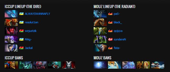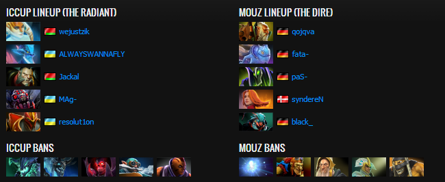 The third game started in a horrible fashion for iCCup, the questionable aggressive trilane failed to seize first blood due to Black's early magic stick saving him and turning the fight around. The kills were basically pouring in for mouz at this lane, especially for Black. iCCup got initated on and killed time after time, sadly for them while struggling in the other two lanes. They desperately tried to gank bottom with Alchemist coming in from mid but FATA responded accordingly, teleported in and threw down his arsenal, resulting in a few kills going his way. The game was looking awkward at this point for iCCup, they had a trilane without too much potential and kept sending it bottom even after losing it over and over, all the time while Qojqva had the time of his life on top. iCCup realized the game was quite impossible to win and called it quits. Mousesports move on to the lower bracket final.
