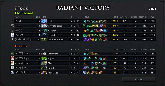 In a gank went wrong, Vici Gaming's Chen overcommited to killing Nature's Prophet and ended up giving away the First Blood to Abaddon who teleported in to stop VG's dive. VG on the other hand, replied with a Crystal Maiden kill on the top lane to equalize the scoreboard at 1-1. Nothing much happened for the next few minutes until a huge engagement broke out on the bottom lane that left Puck, Nature's Prophet and Abaddon dead. Vici Gaming subsequently took two towers from that engagement, swinging the gold graph by 3,000 in their favour in 2 minutes time.