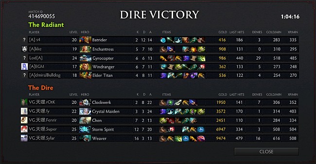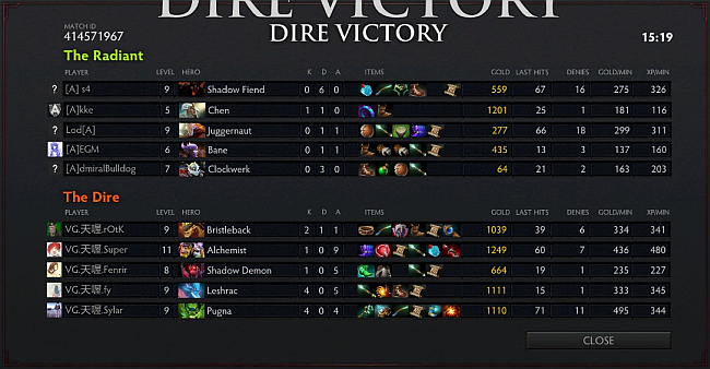 After pulling off a spectacular kill and escape on the top lane (~08:30), Vici Gaming gathered in middle for a push and it did not take too much effort for the Chinese to take down the tier-two. VG immediately transitioned into the Rosh pit and while Alliance were gathered on their side of the river and ready to go, they were a second too late and ended up getting wiped by VG. Loda called the "gg" as Vici Gaming at 15 minutes.