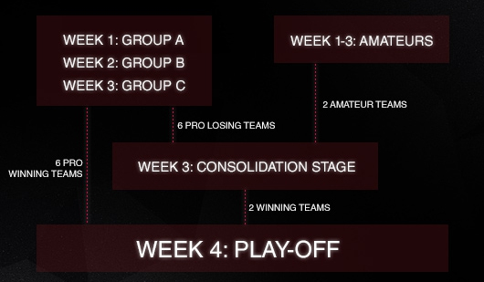 Meanwhile, an amateur tournament will be held simultaneously in the background. Open to everyone, semi-pro/amateur teams are encouraged to participate in this event. All games will be played in a best-of-one single elimination format, and then the top two teams from this amateur event will proceed on to join the other teams awaiting them in the consolidation stage.
