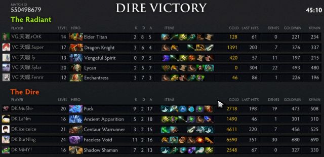 A 25 minute engagement by DK into Vici saw Enchantress immediately imploding, but Vici somehow managed to burn the Aegis off Burning, pick up the gem after Mushi's death, and kill Ancient Apparition without further losses: a 1 for 2 + Aegis trade. The game then went into a period of farming while waiting for Roshan to spawn. Two consecutive pickoffs on Vengeful Spirit and Elder Titan saw DK picking up the aegis while Lycan took the top tier 2.