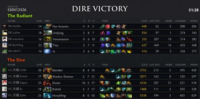 10 minutes in, Vici took three kills across the map with Batrider's Blink Dagger picking off Burning and a failed gank by Mushi on Morplhing left iceiceice to die. Even though DK took down the mid tier 1 in the process, they were 2,000 gold and 4,000 exp behind. A failed gank on Burning and Io left their top tower exposed, taken out by iceiceice while Burning ticked out to Doom in exchange for both of Vici's supports.