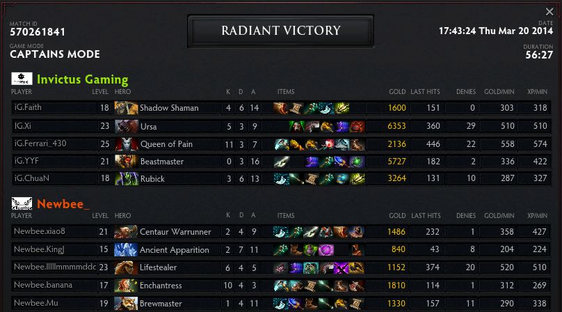 42 minutes in, the third Roshan went to NewBee, allowing NewBee to mount a comeback after Ferrari was caught without a buyback. The opening gave NewBee the take mid barracks, iG could not contend with their most farmed hero being off the map, thus swinging the match in NewBee's favour. However the next Roshan became the downfall for NewBee, where a great initiation in the pit allowed iG to isolate Lifestealer while Ferrari kept the rest of NewBee busy. Ferrari survived and took down two a support in the process while iG just wrecked Brewmaster while he was split into three. Lifestealer bought back and rejoined the fight but Roar was just off cooldown again and he went down a second time alongside Centaur. Without a buyback on Lifestealer, NewBee were unable to defend against iG's push that took out the tier 3 and immediately went for throne, surpassing the barracks and winning them the game.